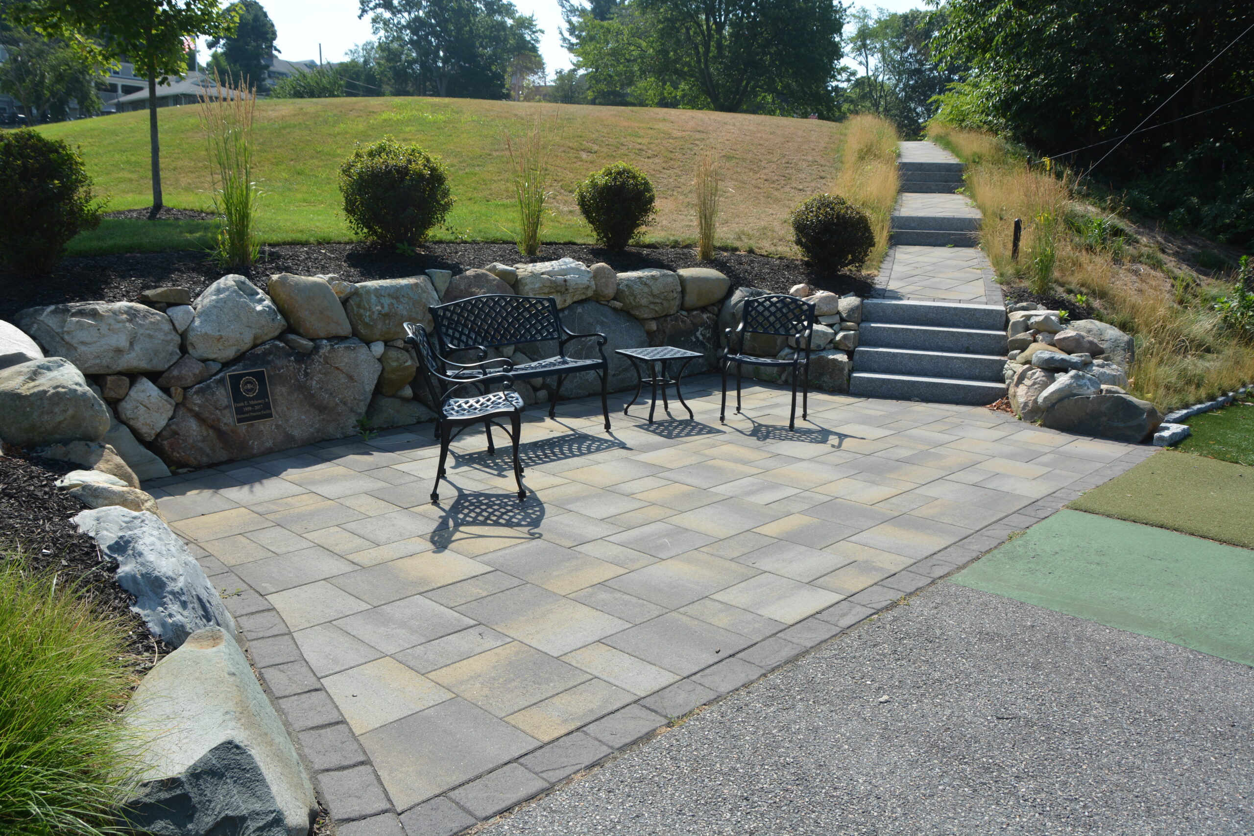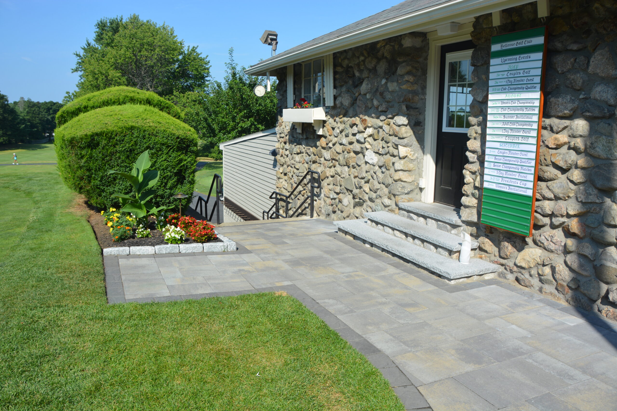 Multiple walkways, including the front entrance walkway, received upgrades such as cobblestone borders with veneer and granite caps being added to multiple walls and stairways around the property. Other additions included a new 275-square foot walkway to the parking lot, a bocce ball court and the installation of a transformer and landscaping lighting throughout the property.
