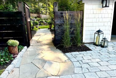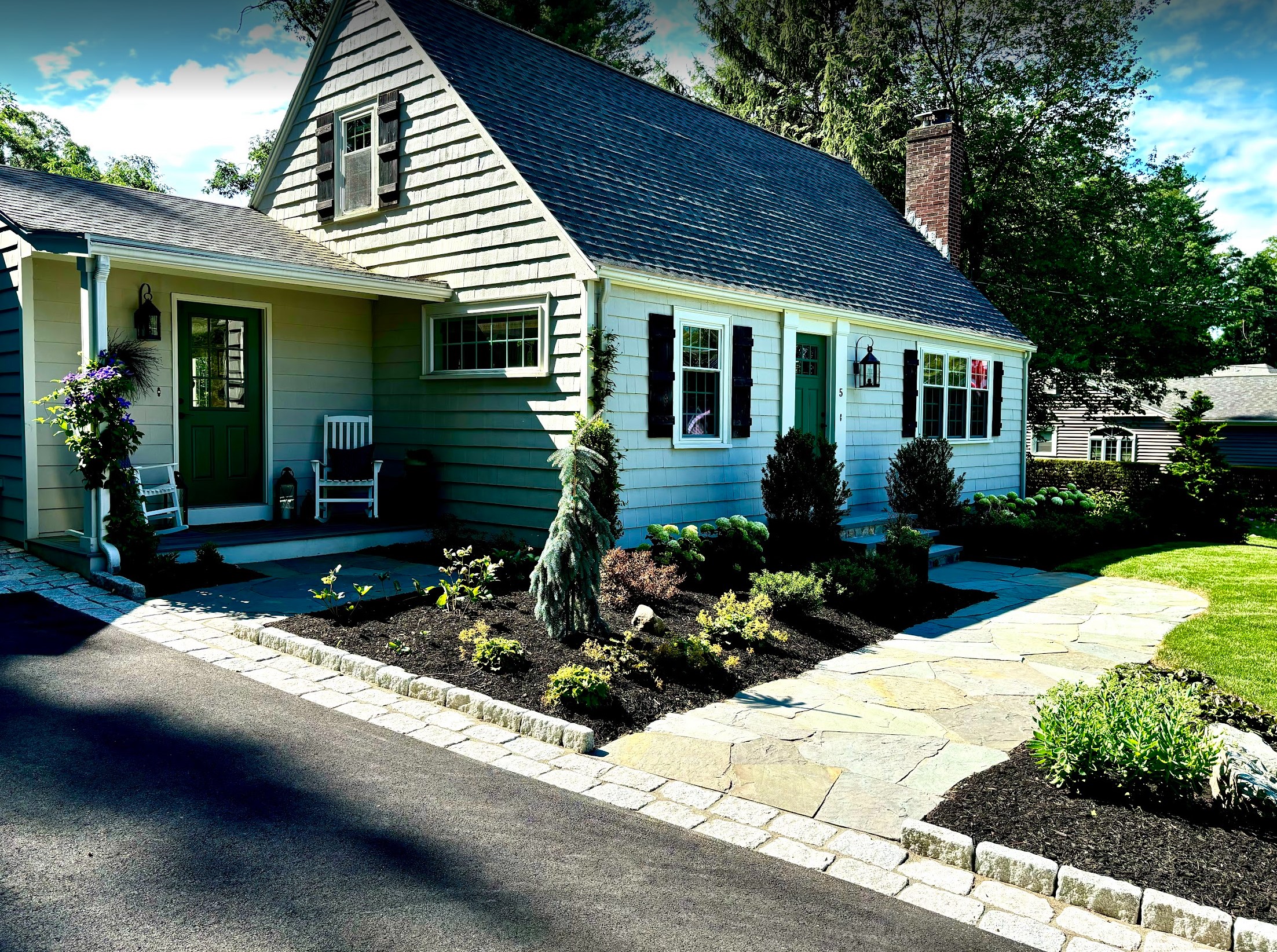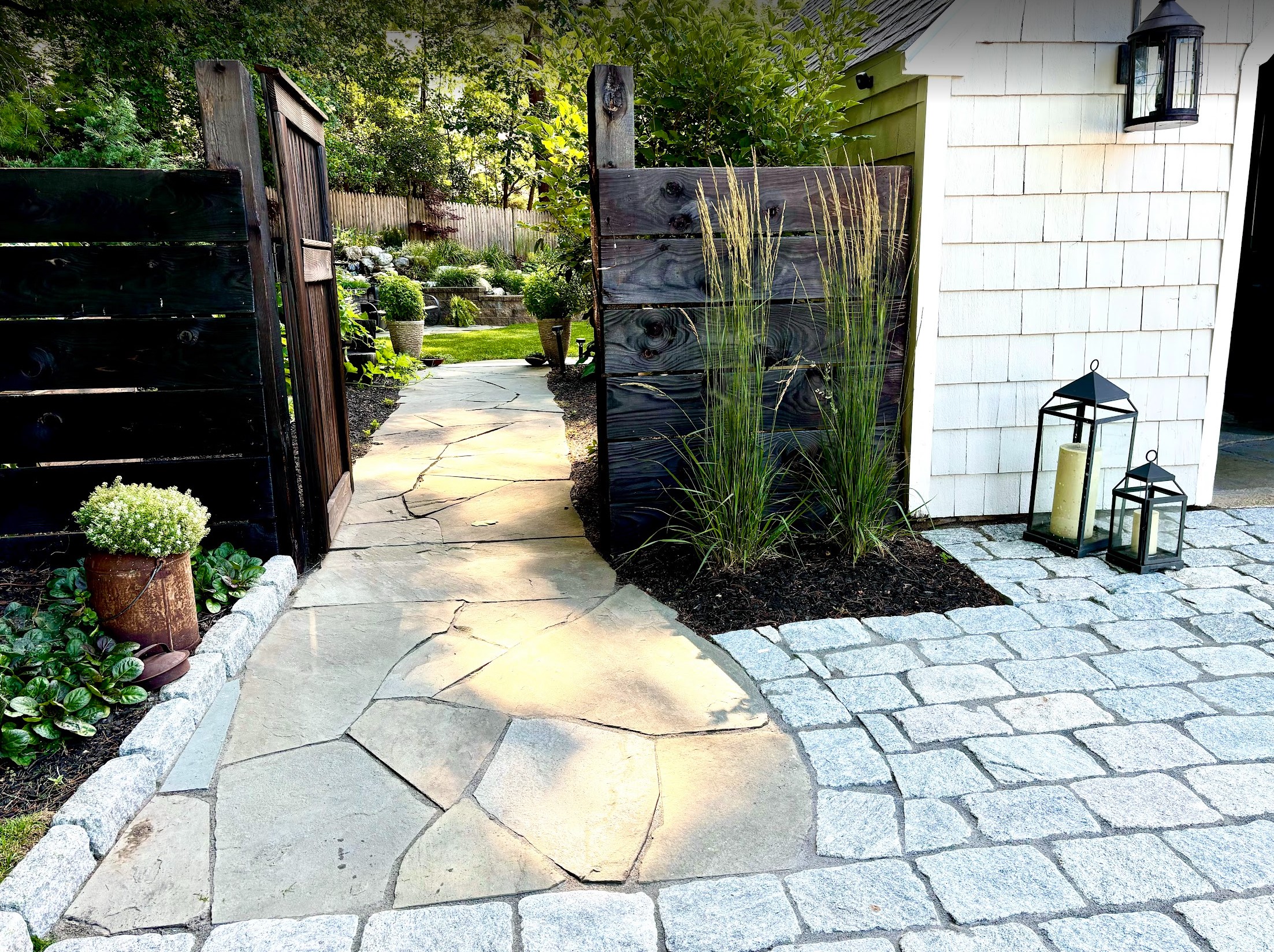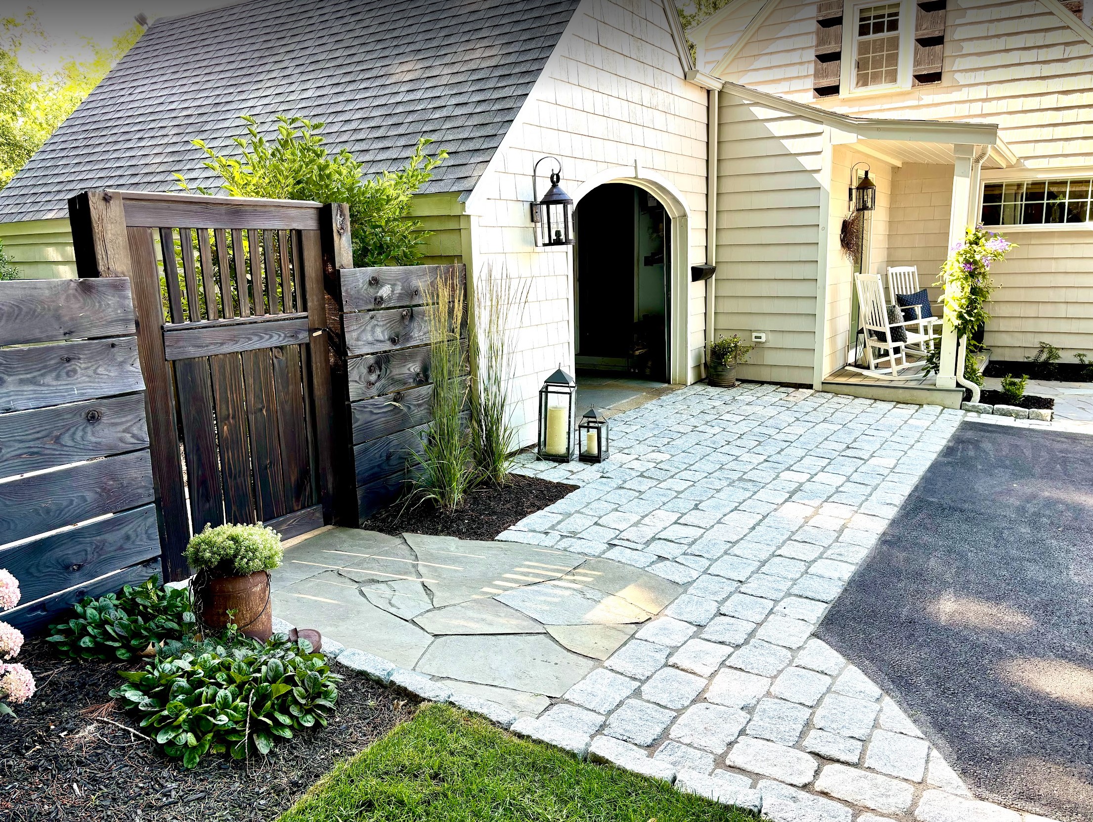 From the start, the design centered around authenticity. Flagstone was chosen for its natural variation and organic edges, offering a timeworn look underfoot that instantly brought a sense of history to the space. Cobblestones were carefully placed to define transitions and anchor the layout with a classic European feel—each stone telling its own story. These materials, aged by nature and selected with purpose, provided the bones of the space.