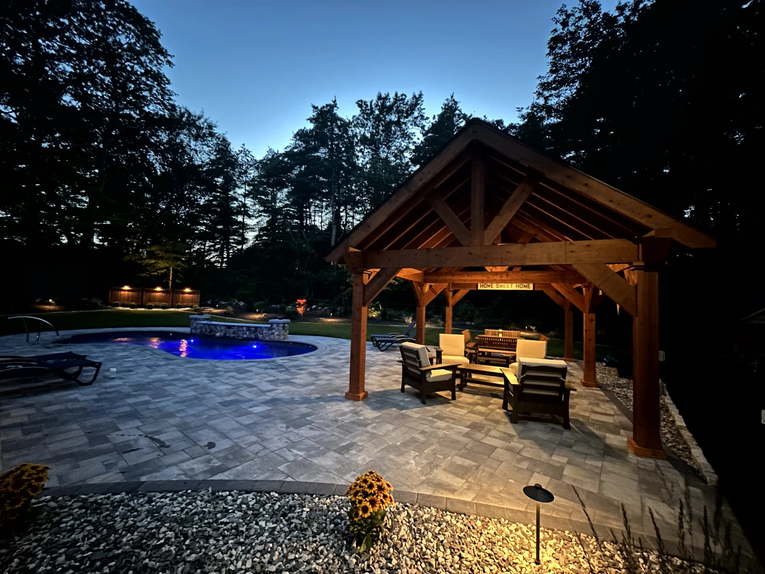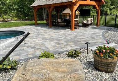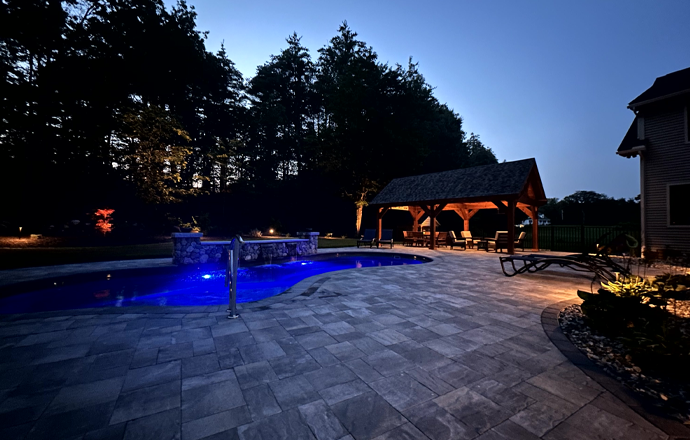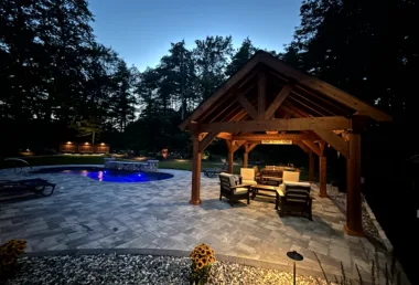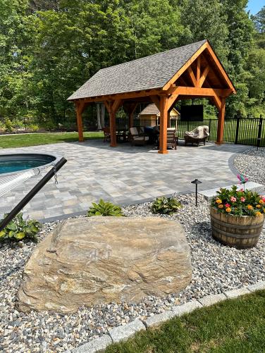 Surrounding the pool is a sprawling patio space designed with plenty of room for relaxing in the sun by the pool. This patio boasts a stone fire pit to gather around on chilly New Hampshire nights. This patio also boast an area to relax in a hammock by the pool, as well as plenty of space for lounge chairs. On the other side to finish the patio off we collaborated to bring in a stunning pergola from Eastern Shed. The homeowners can now swim and then escape the sun and relax in style. Our design team has worked seamlessly with Eastern Shed on multiple occasions to create luxurious outdoor spaces perfect for dining and unwinding. This pergola features an overhead fan, as well as a TV so this family can watch movies or sporting events with friends and family.