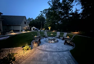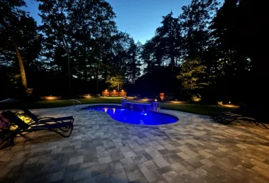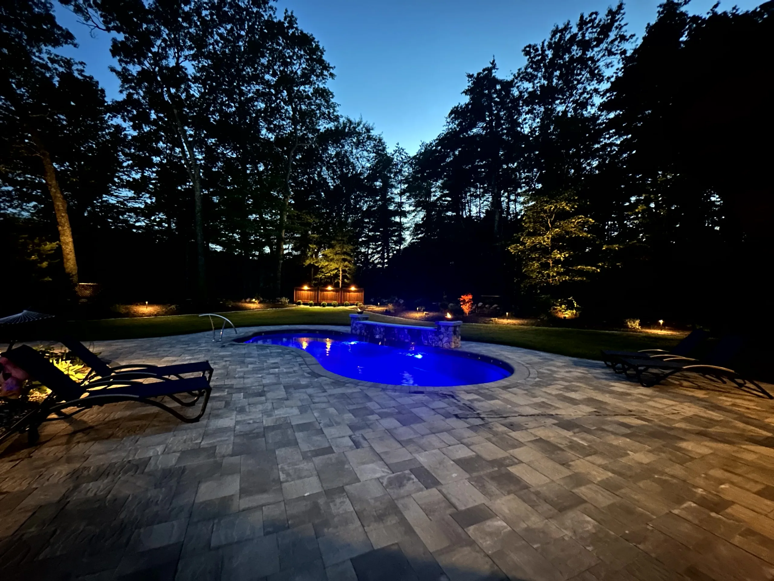 This project was finished off with the addition of low voltage landscape lights to make the space a warm, inviting atmosphere with the flick of a switch. Both the pool and landscape lighting are integrated through the omni logic control system for ease of use. Our team was able to create the perfect ambiance for outdoor gatherings and relaxation to maximize this family’s use of their beautiful new yard.