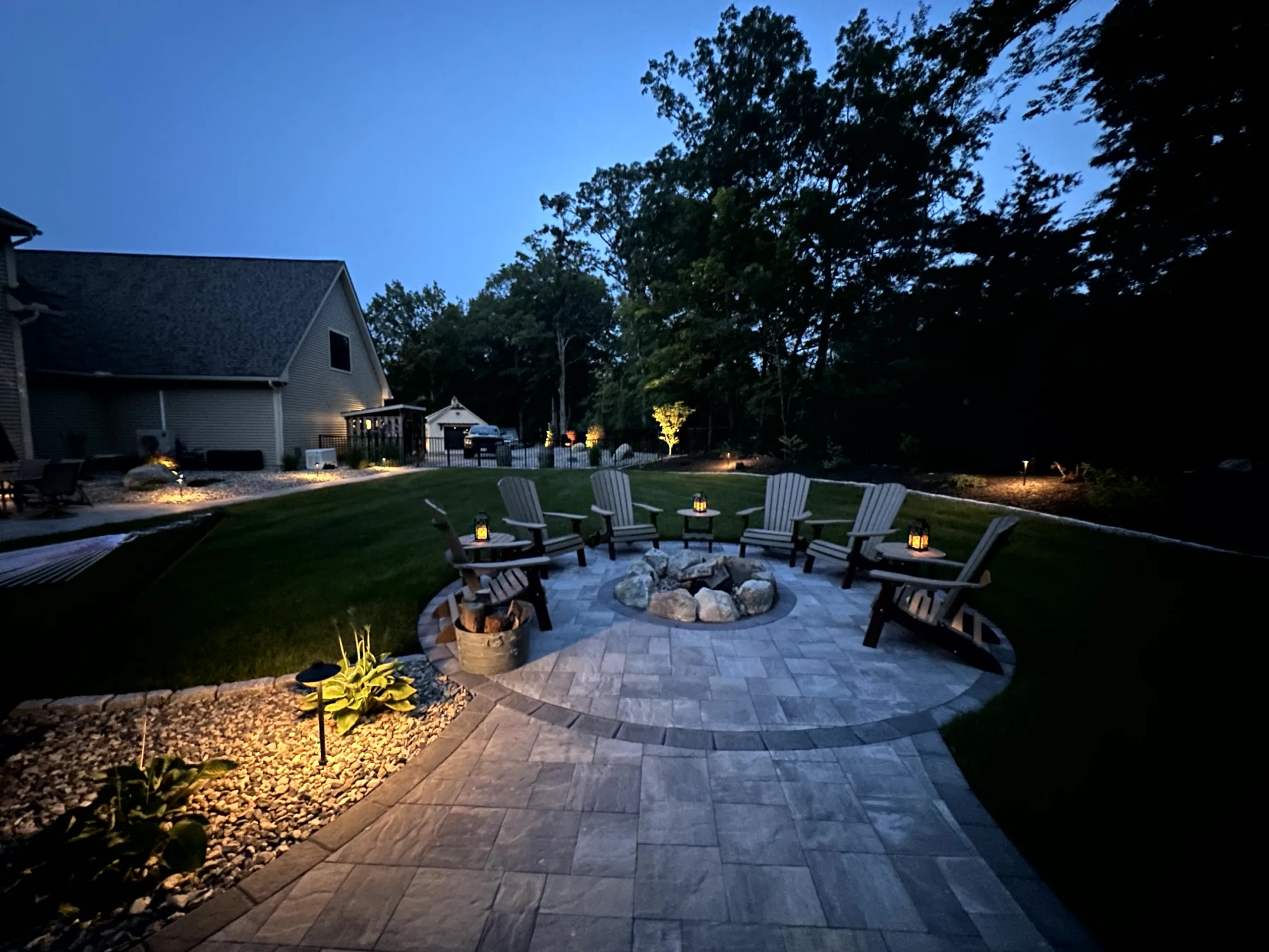Located In Derry NH, this property was located in a wood lined area that is private and expansive. The homeowners wanted to transform their blank slate of a backyard that retained water into an inviting space that doubles as both a peaceful retreat and an entertainment hub.